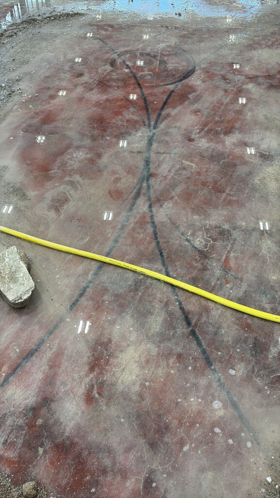 LA PISTA Due erano le priorità: il rifacimento integrale della pavimentazione e la messa a norma della recinzione. Per quanto riguarda la pista, è stato necessario demolire le piastrelle e la caldana ormai logora, fino a riportare alla luce la storica pavimentazione rossa – che ha risvegliato negli ultracinquantenni presenti nel cantiere memorie di partite di pallacanestro e hockey del secolo scorso e interminabili sessioni di obbligatori di pattinaggio. La vera sfida tecnologica è stato il nuovo getto, che ha richiesto uno studio su misura ai tecnici di SuperBeton, in stretta collaborazione con Mapei: 800 metri quadrati di superficie unica e jointless (ovvero senza giunti intermedi), 160 metri cubi di calcestruzzo, 16 betoniere, centinaia di metri di armatura in ferro, un impasto in grado di reggere la sfida dell’intenso calore estivo e dei tempi serrati di maturazione. La superficie è stata elicotterata, finita con la tecnica del fresco su fresco con spolvero al quarzo e, ad asciugatura completata, trattata con silicato di litio.